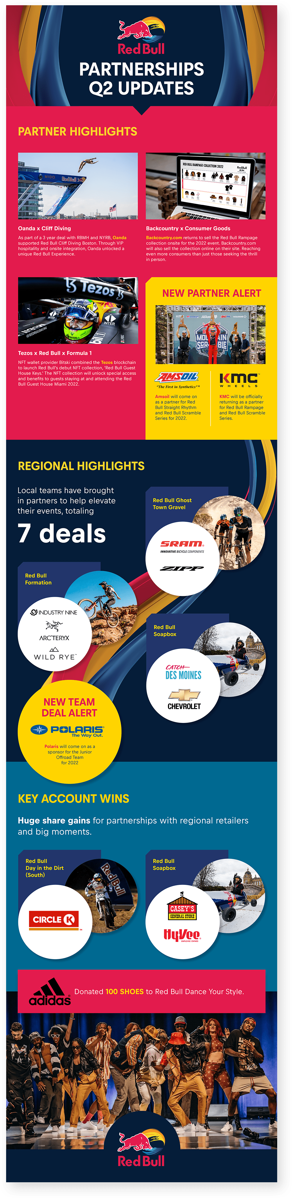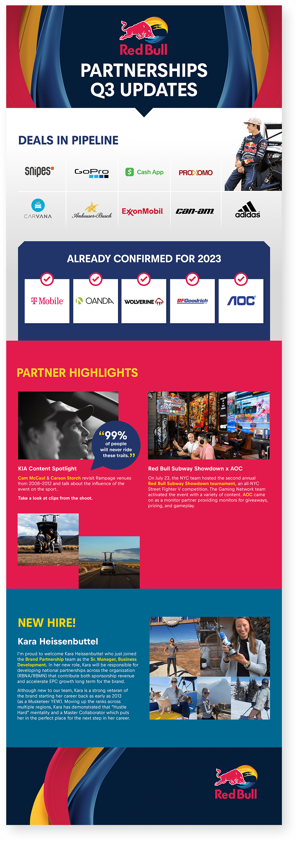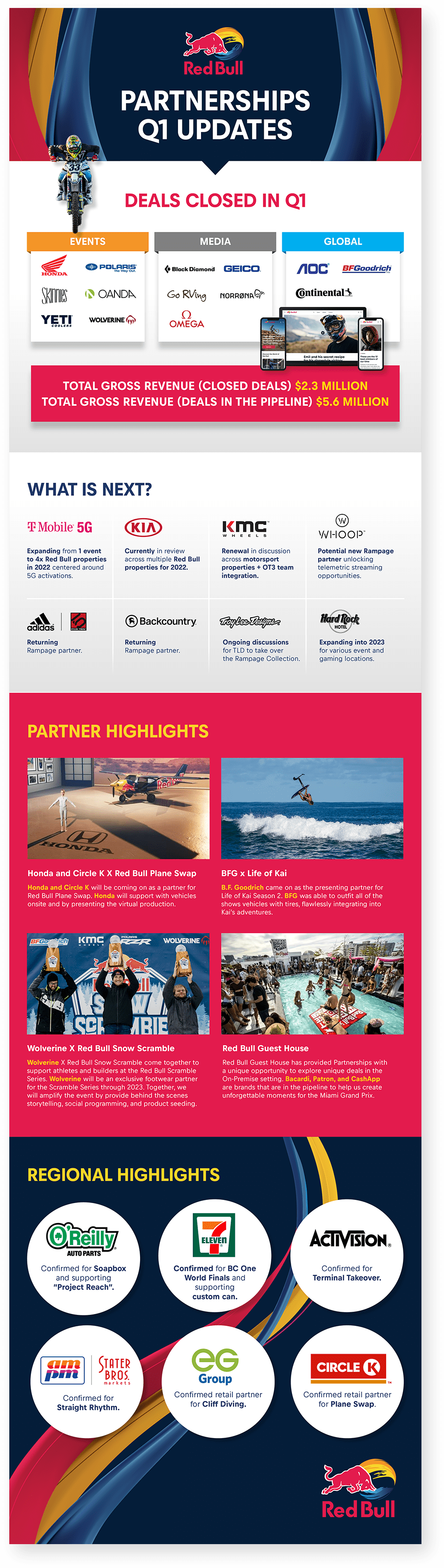 Red Bull Brand Partnerships hired SockEm Design to create turnkey marketing collateral to aid their sales team in building long-term, strategic, worldwide partnerships with premium 3rd party companies for Red Bull’s unique global and local events. Internal communications were reinforced with quarterly e-newsletters that highlighted sales progress.