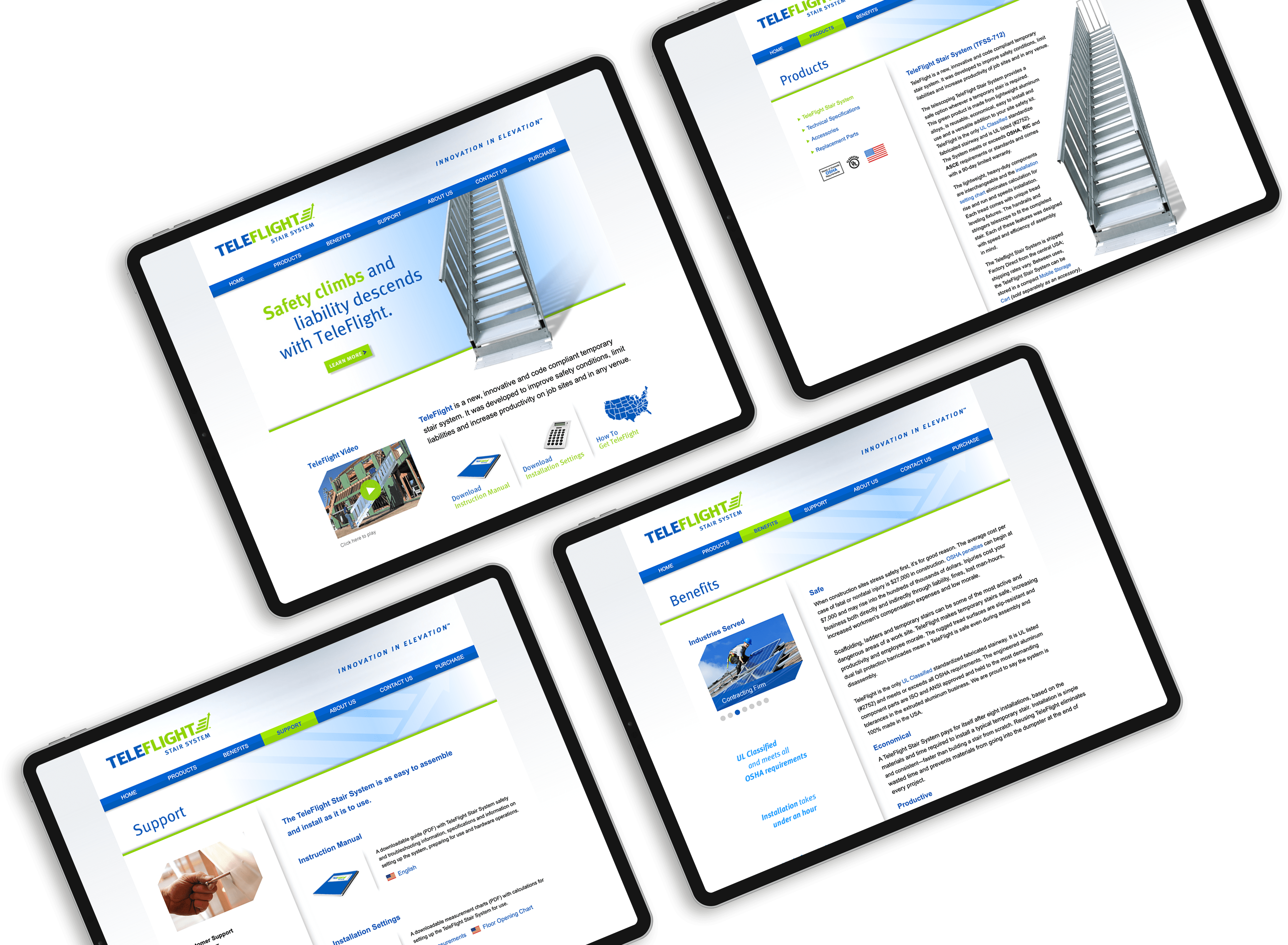 TeleFlight Stair System is an innovative, code-compliant temporary/permanent stair system. It was developed to improve safety conditions, limit liabilities, and increase productivity on job sites and in any venue. SockEm Design assisted with launching TeleFlight Stair Systems with a new logo and visual identity to push the product to market.